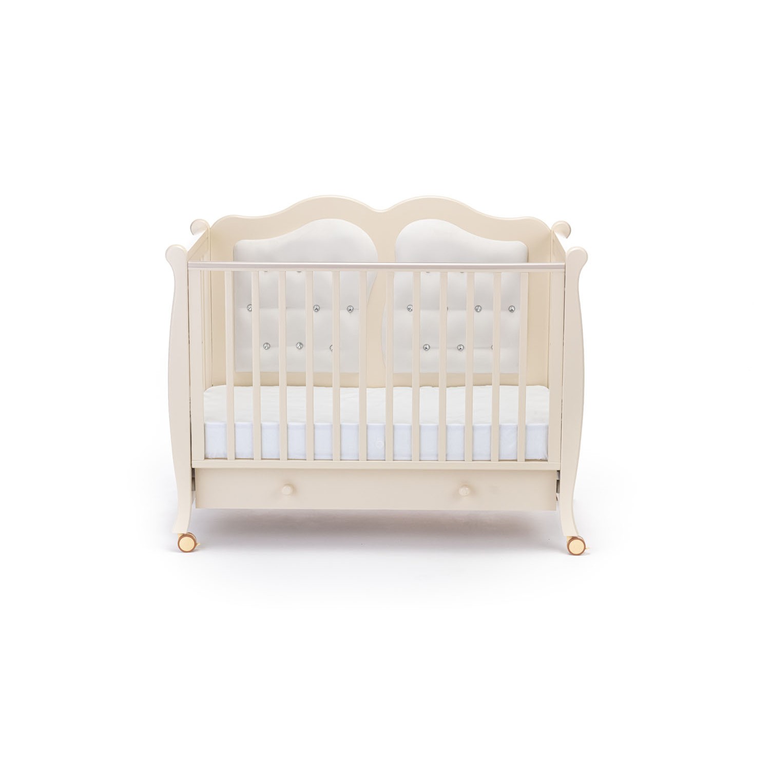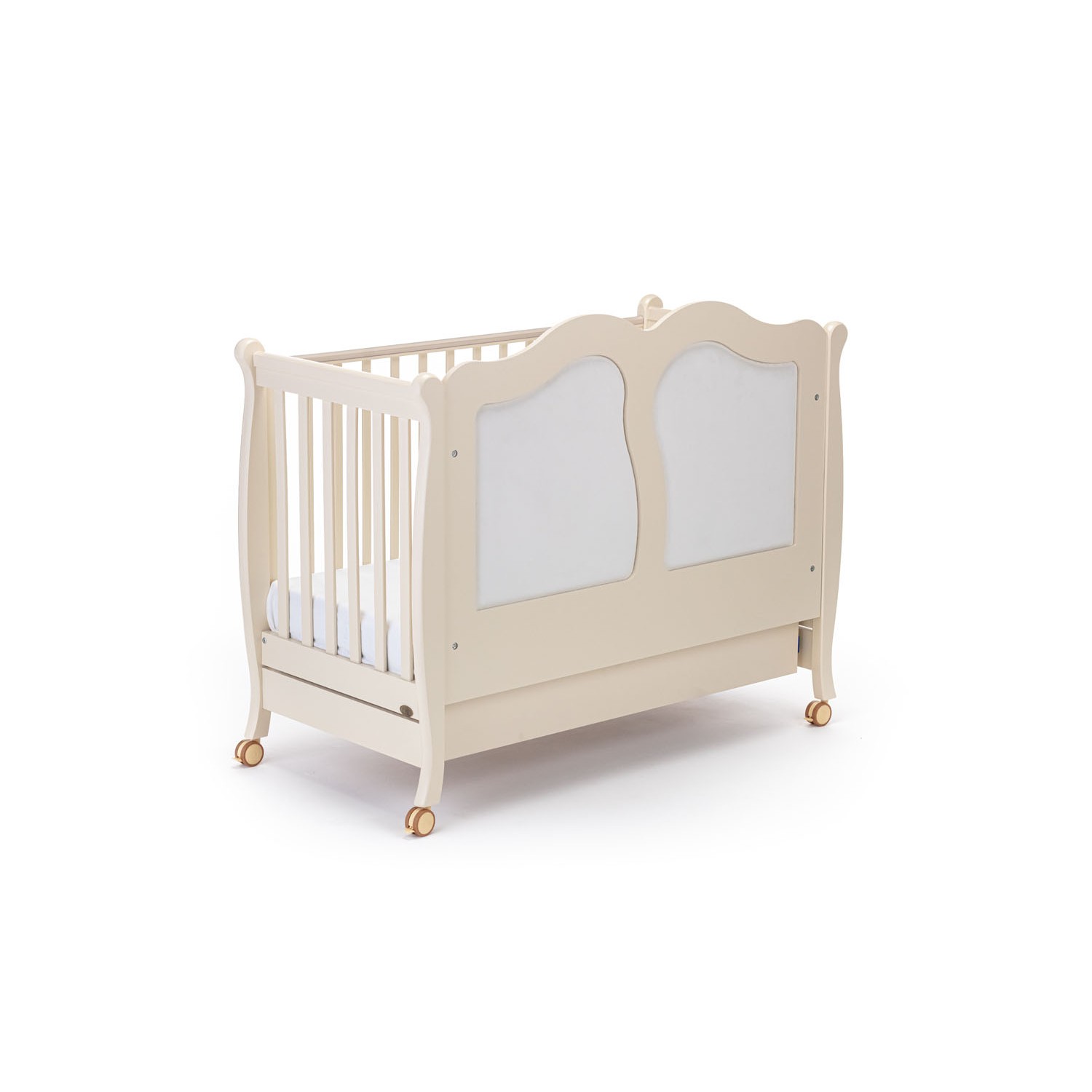 Легкое перемещение кроватки обеспечивается наличием 4-х прорезиненных колесиков. За фиксацию на месте отвечают стопоры, присутствующие на каждом из колес. Кроватка изготовлена из массива бука, отделочные элементы выполнены из МДФ, в конструкции ящика для белья используется ЛДСП. Качество всех материалов, покрытия и фурнитуры соответствует европейским стандартам.