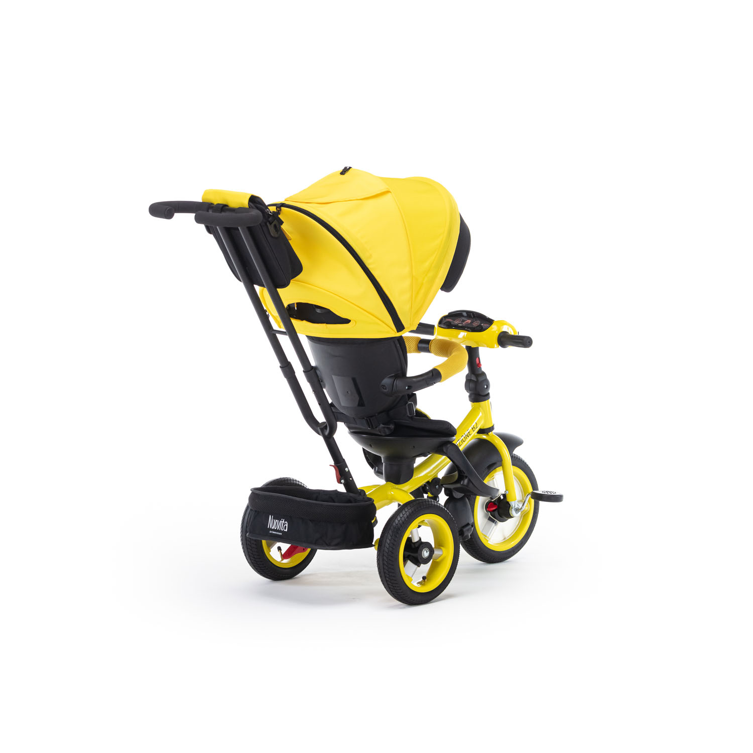 3. Трехколесный велосипед для начинающих со складной подножкой. Благодаря функции свободного хода колеса малыш может крутить педали, имитируя самостоятельную езду. Он получает новый опыт и учится кататься, движение велосипеда в это время контролирует взрослый. Капор и бампер можно снять. Подойдет малышам от 2-х лет.